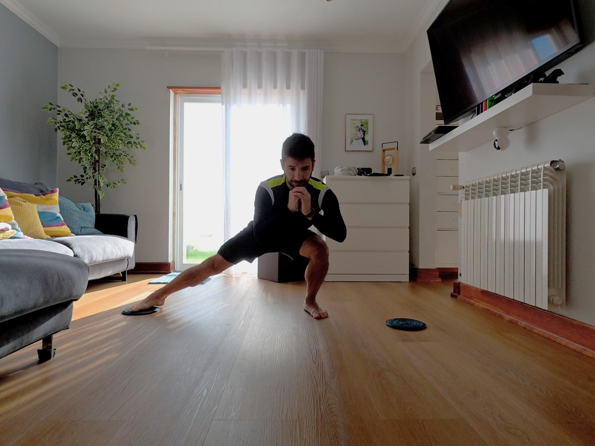 Peso do corpo e material simples, bandas, elásticos, discos. Plano claro, progressão e mobilidade para ganhares força sem complicar.